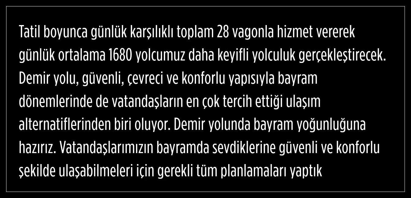 Vatandaşların bayramın bereketini ve sevinç ortamını doyasıya yaşaması için YHT, ana hat ve bölgesel trenlerde 10 bin 866 kişilik kapasite artışı sağlayacaklarını ifade eden Uraloğlu, hem yüksek hızlı hem onvansiyonel tren hatlarında gerekli planlamaların tamamlandığını belirtti.