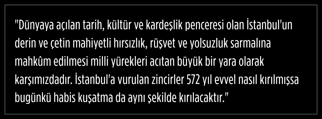 İstanbul'un şu an liyakatsiz ellerde kaldığını ifade eden Bahçeli, şehrin yolsuzluk ve rüşvet sarmalına mahkûm edildiğini ve bunun millî vicdanı yaraladığını şu sözlerle dile getirdi: