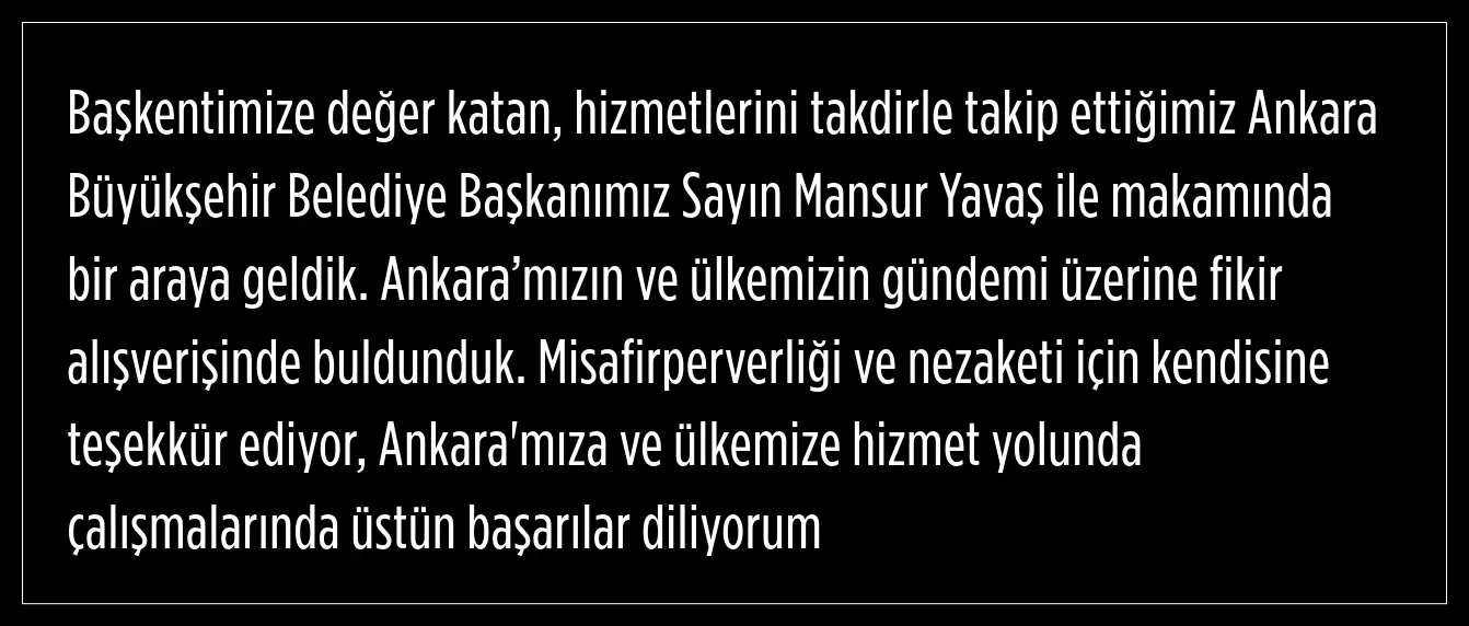 "Ankara'mıza ve ülkemize hizmet yolunda çalışmalarında üstün başarılar diliyorum"