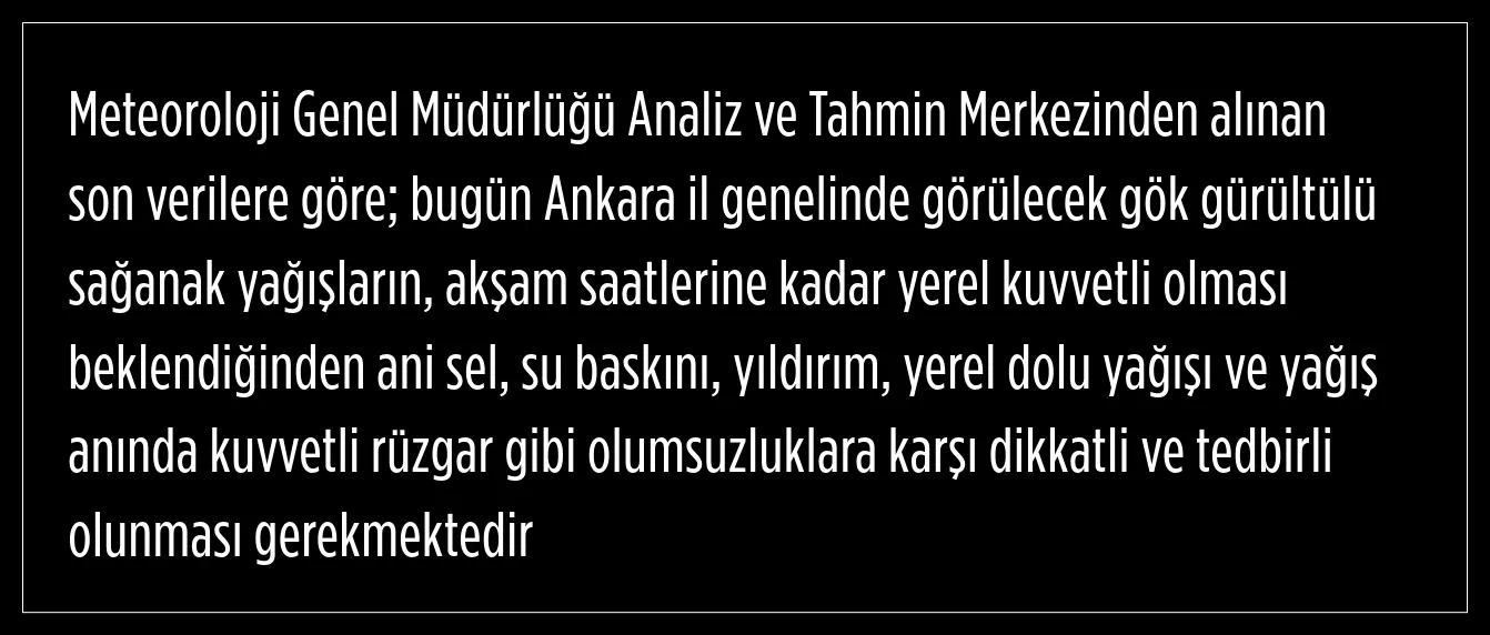 Valilik, Ankara il genelinde görülecek gök gürültülü sağanak yağışların, akşam saatlerine kadar yerel kuvvetli olacağını belirtti.