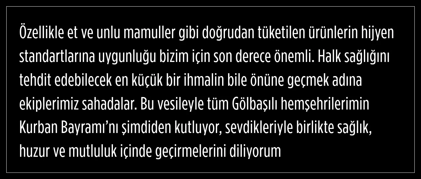Kurban Bayramı'nın paylaşmanın ve dayanışmanın en güzel örneklerinin yaşandığı, toplum olarak birbirine daha çok kenetlenilen özel günlerden birisi olduğunu ifade eden Gölbaşı Belediye Başkanı Yakup Odabaşı, bu özel günlerde vatandaşların sağlıklı, güvenli ve hijyenik ortamlarda alışveriş yapmalarının kendileri için öncelikli sorumluluklardan biri olduğunu söyledi.