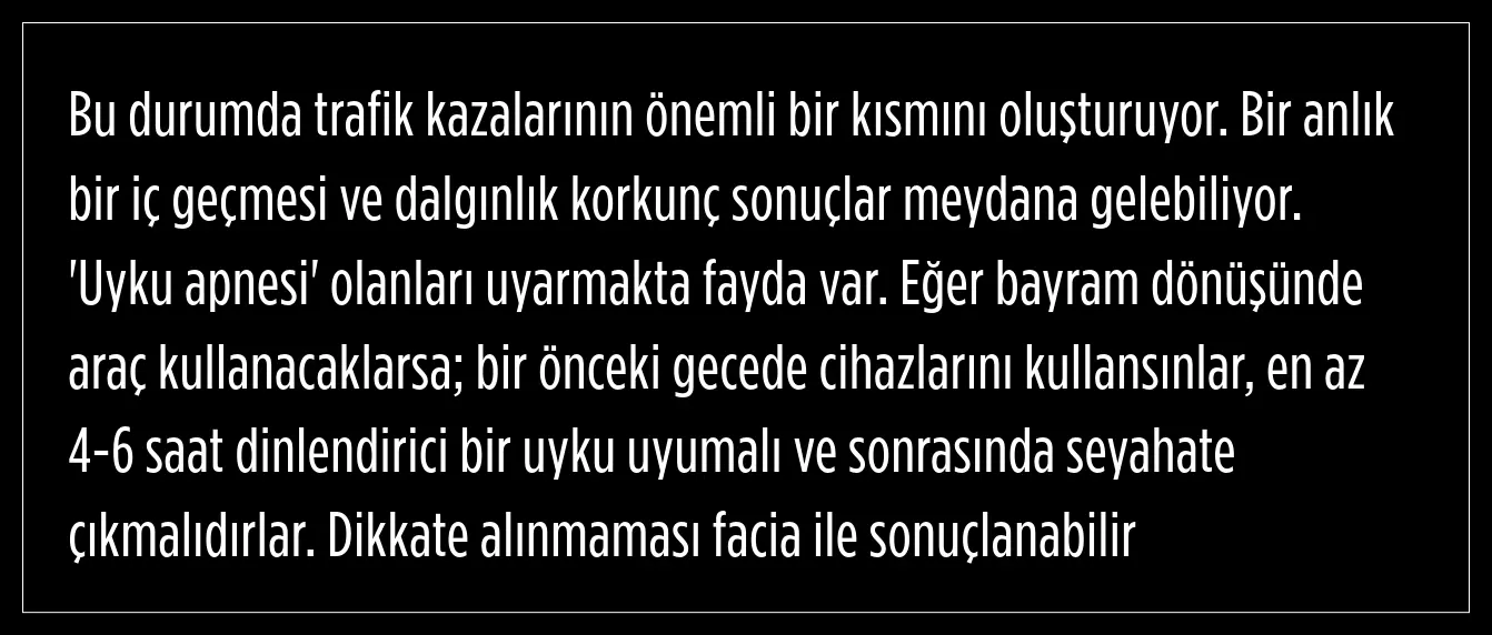 Bayram tatili dönüşlerinin başladığını, uzun mesafeli araç kullanımının söz konusu olacağını ifade eden Özlü, bu süreçte özellikle 'uyku apnesi' olanların gece boyunca dinlendirici bir uyku uyuyamadığını söyledi.
