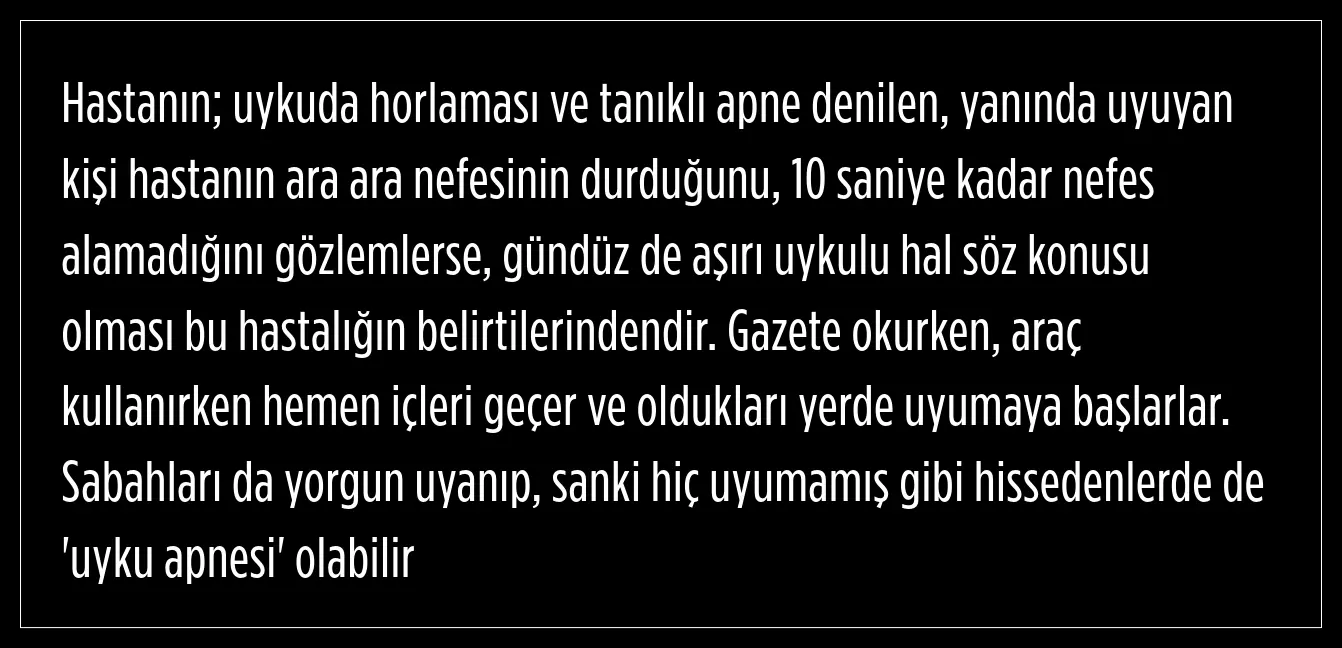 Bu kişilerin çok uyuduğunun söylendiğini fakat ne kadar uyusalar da dinlendirici, kaliteli derin bir uyku uyuyamadıklarını dile getiren Tevfik Özlü, uyku apnesi olan kişilerin bundan dolayı gün boyu uyku halinde olduğunu aktardı.