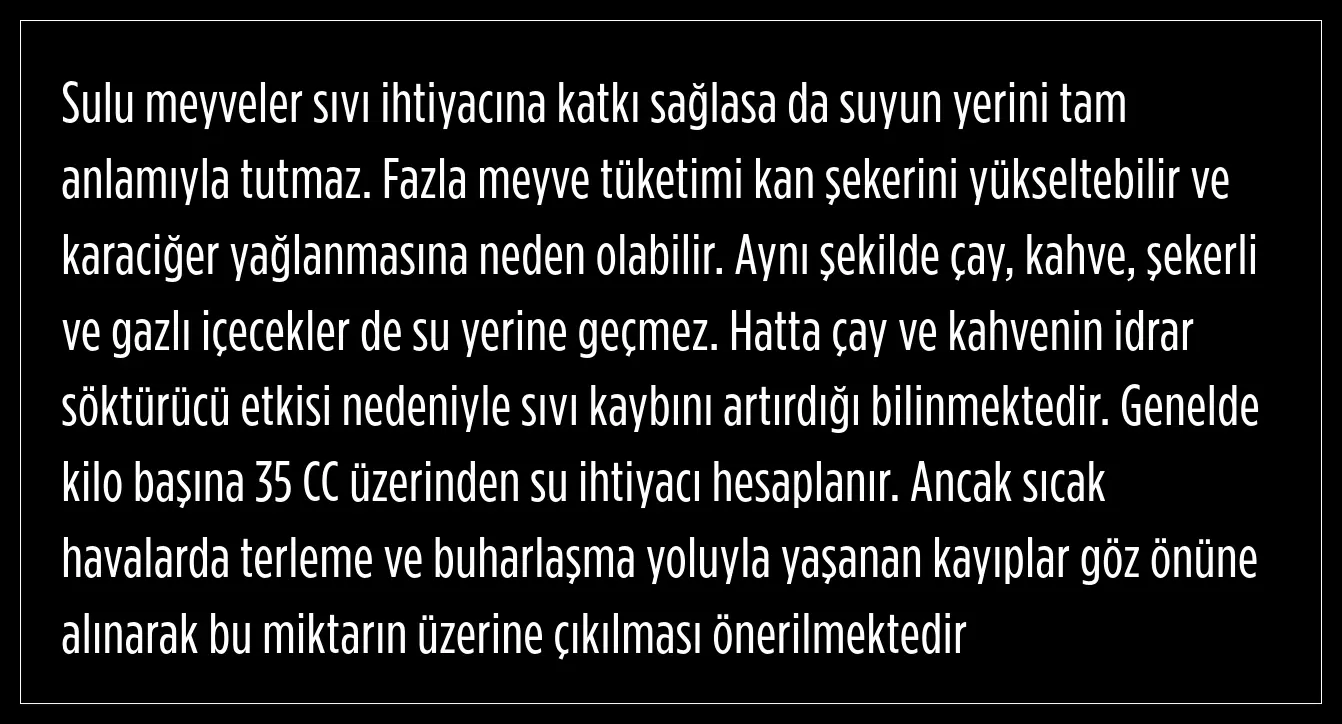 "çay, kahve, şekerli ve gazlı içecekler de su yerine geçmez"