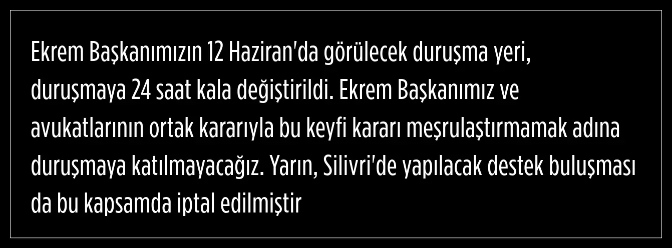 Cumhuriyet Halk Partisi İstanbul İl Başkanlığı'ndan yapılan açıklamada, Ekrem İmamoğlu'nun 12 Haziran'da görülecek duruşma yerinin duruşmaya 24 saat kala değiştirildiği ifade edildi.