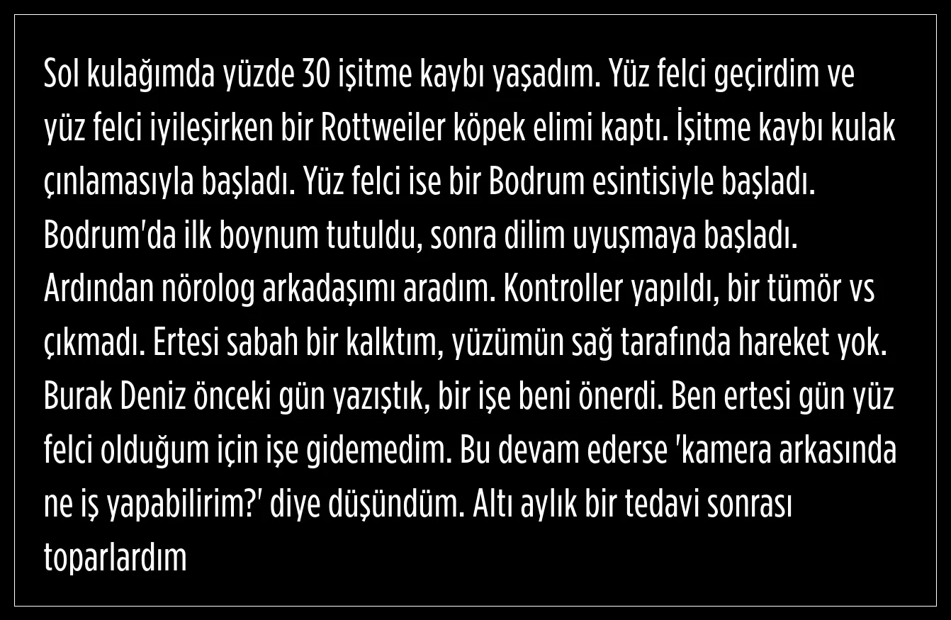 İşitme kaybının kulak çınlaması ile başladığını aktaran yakışıklı oyuncu, yüz felcinin ise bir Bodrum esintisiyle başladığını aktardı.