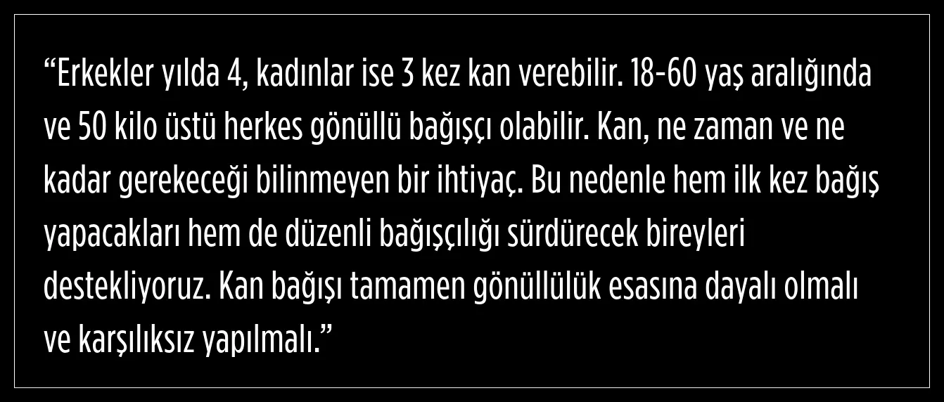 “Kan üretilebilen bir şey değil. Bir hastaya yardım edebilmek, onun şifasına katkı sunmak çok büyük bir duygu. Uzmanlar da düzenli bağışa teşvik edince devam ettim. Kendimi sağlıklı hissettiğim sürece bağış yapmaya devam edeceğim.”