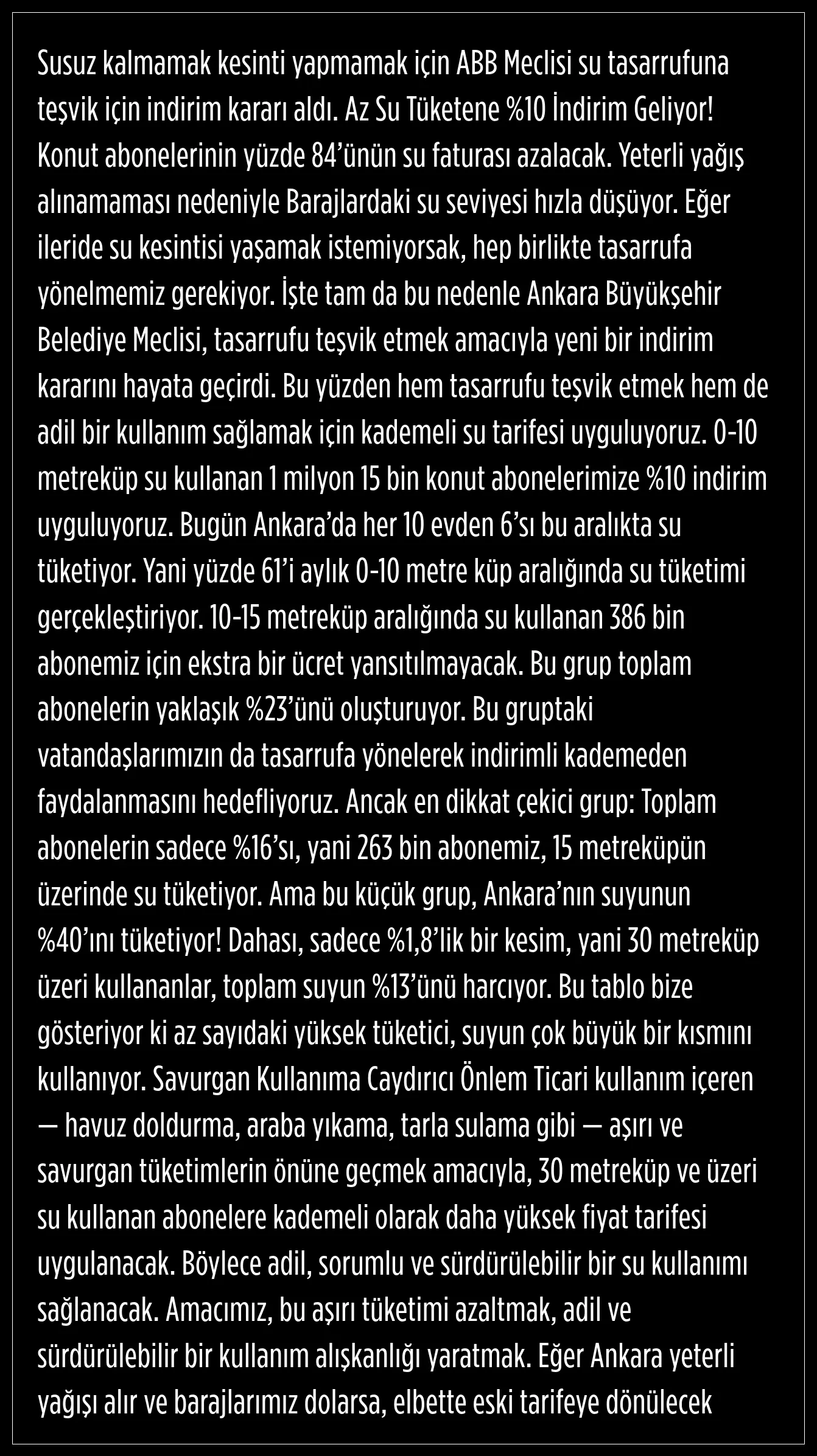 Müdürlük, bu nedenden dolayı Ankara Büyükşehir Belediye Meclisi'nin tasarrufu teşvik etmek amacıyla yeni bir indirim kararını hayata geçirdiğini ve bu yüzden hem tasarrufu teşvik etmek hem de adil bir kullanım sağlamak için kademeli su tarifesi uyguladıklarını belirtti.
