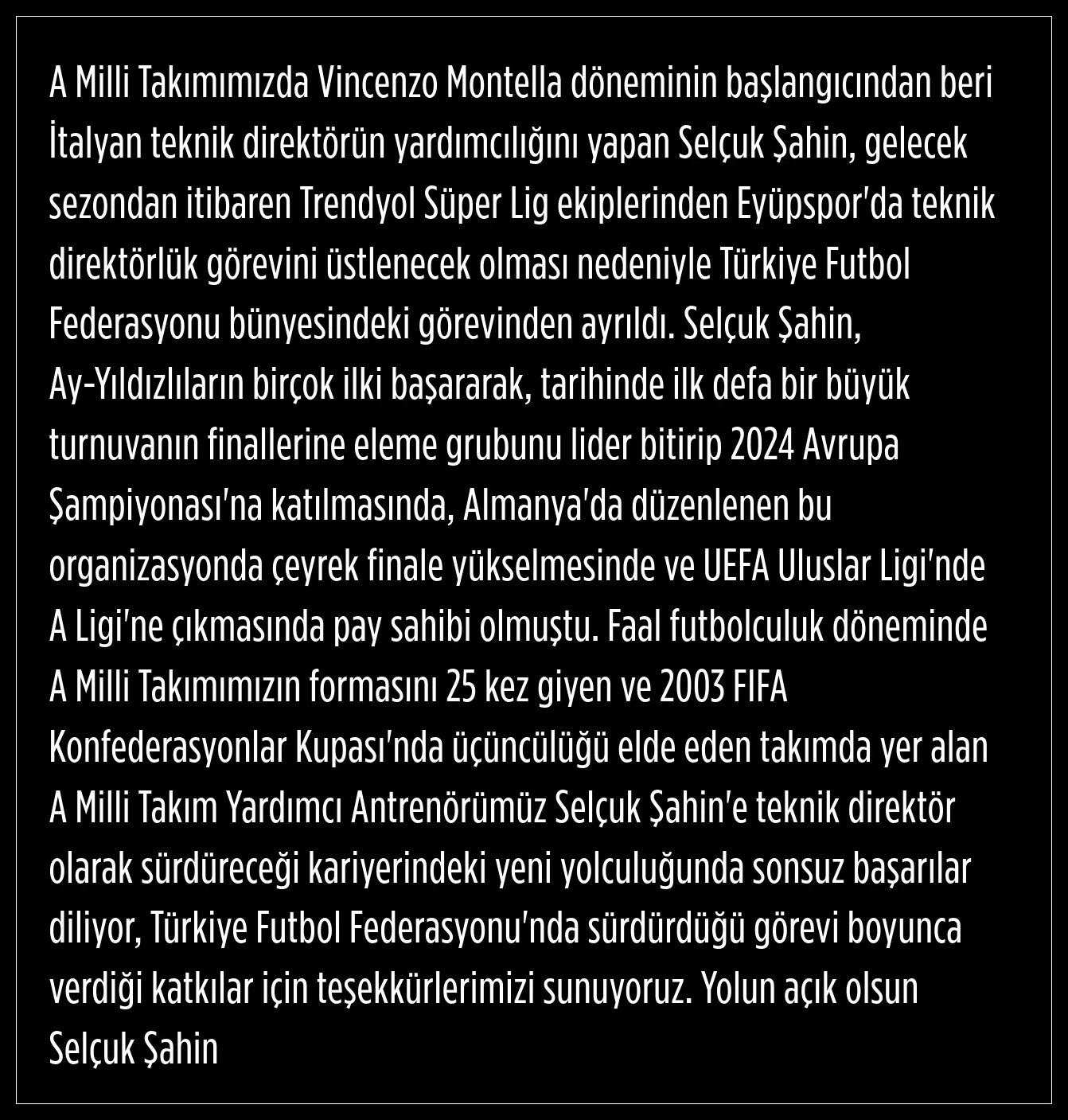 Açıklamada, Selçuk Şahin'in gelecek sezondan itibaren Trendyol Süper Lig ekiplerinden Eyüpspor'da teknik direktörlük görevini üstlenecek olması nedeniyle Türkiye Futbol Federasyonu bünyesindeki görevinden ayrıldığı ifade edildi.