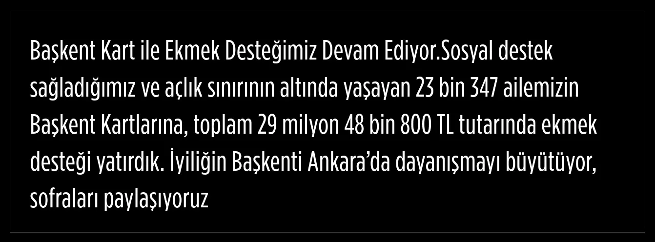 Ankara Büyükşehir Belediyesi, sosyal destek sağladıkları ve açlık sınırının altında yaşayan 23 bin 347 aileye 29 milyon 48 bin 800 TL tutarında ekmek desteğinde bulundu.