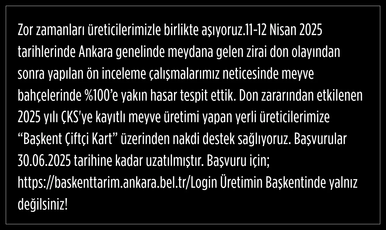 Açıklamada, don zararından etkilenen 2025 yılı ÇKS'ye kayıtlı meyve üretimi yapan yerli üreticiye Başkent Çiftçi Kart üzerinden nakdi destek sağlandığı belirtildi.