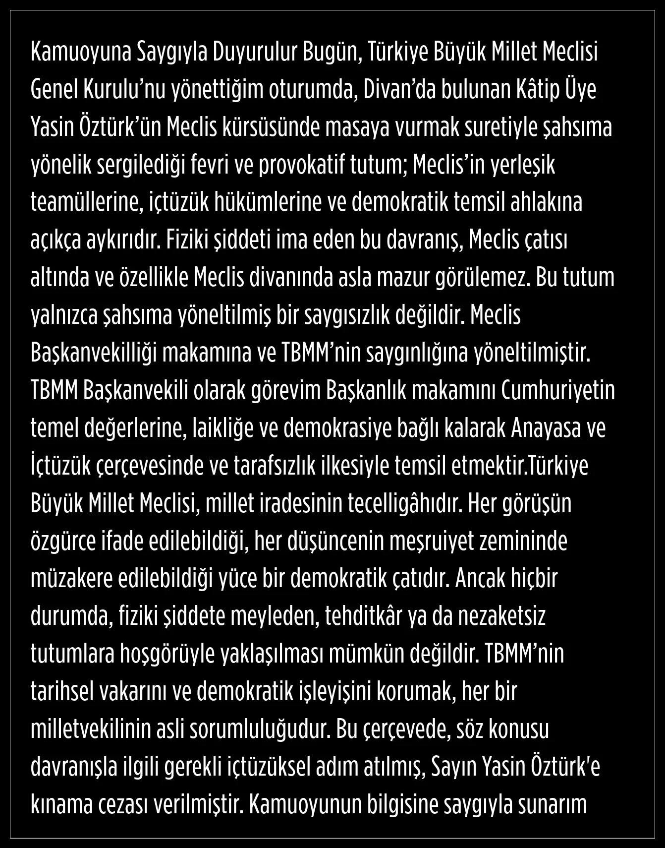 "Sayın Yasin Öztürk'e kınama cezası verilmiştir"