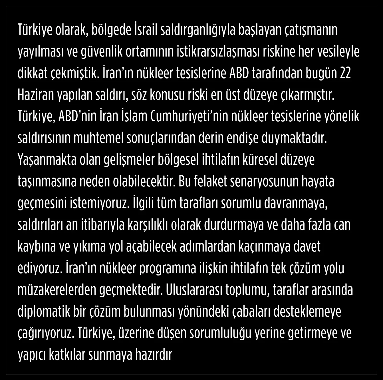 Türkiye'nin ABD’nin İran İslam Cumhuriyeti’nin nükleer tesislerine yönelik saldırısının muhtemel sonuçlarından derin endişe duyduğu belirtilen açıklamada, ilgili tüm taraflar sorumlu davranmaya davet edildi.