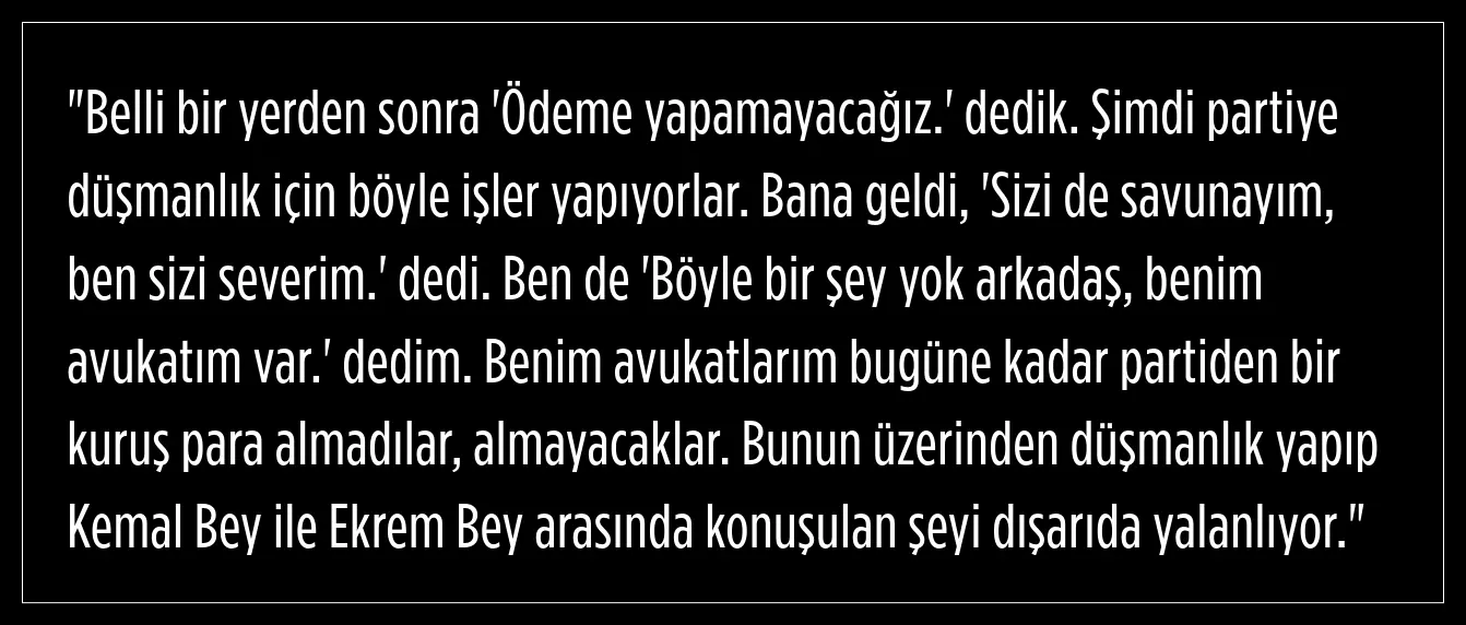 Söz konusu avukatın geçmişte Kılıçdaroğlu'nun davalarını görmek üzere partiden ödeme aldığını ifade eden Özel, kendi avukatının ise hiç ödeme almadığını vurguladı. Özel, partinin genel başkanını savunmak amacıyla para alınamayacağına dikkat çekti. Partinin dar imkânlara sahip olduğunu ve birçok sorun ile mücadele ettiğini dile getiren Özel, şu ifadeleri kullandı: