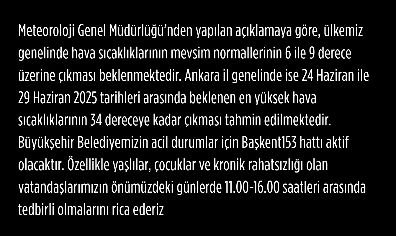 Ankara'da hava sıcaklığı, yarından itibaren 6 ile 9 derece artması bekleniyor. Ankara Büyükşehir Belediyesi, sıcaklığa karşı vatandaşları uyardı.