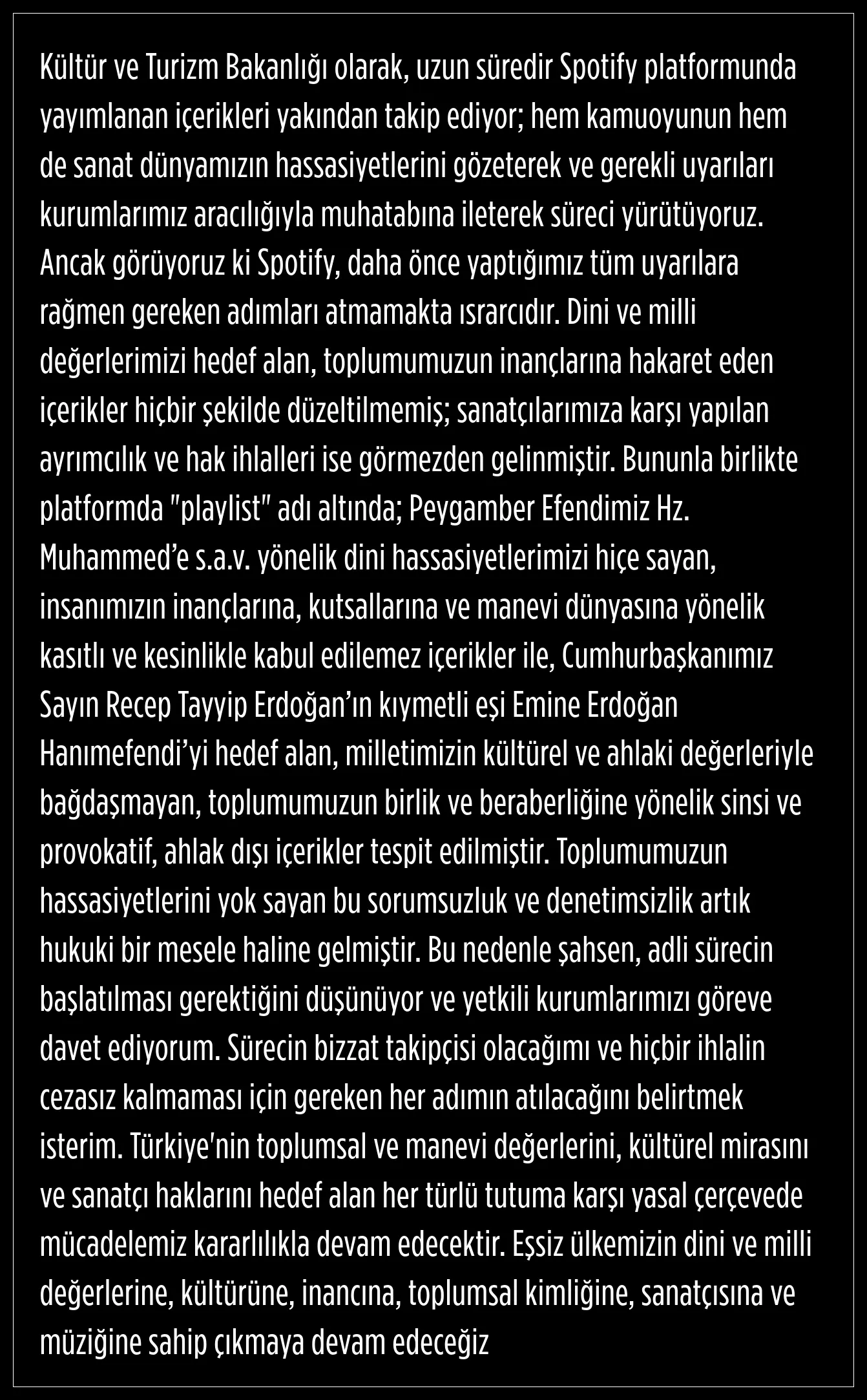 Mumcu, Kültür ve Turizm Bakanlığı olarak, uzun süredir Spotify platformunda yayımlanan içerikleri yakından takip ettiklerini ifade etti. Bakan Yardımcısı Mumcu, hem kamuoyunun hem de sanat dünyasının hassasiyetlerini gözeterek ve gerekli uyarıları kurumlar aracılığıyla muhatabına ileterek süreci yürüttüklerini söyledi.