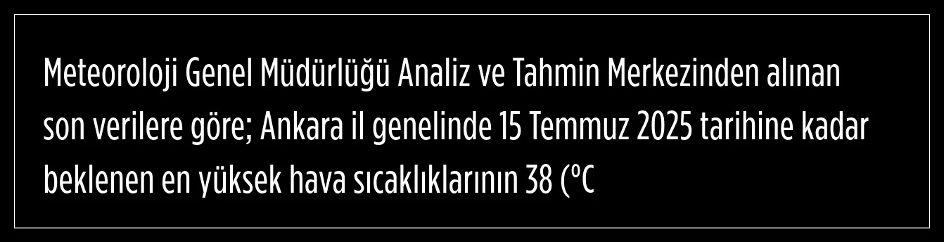 Valilik, Ankara il genelinde 15 Temmuz 2025 tarihine kadar beklenen en yüksek hava sıcaklıklarının 38 (°C) civarında olacağının tahmin edildiğini belirtti.