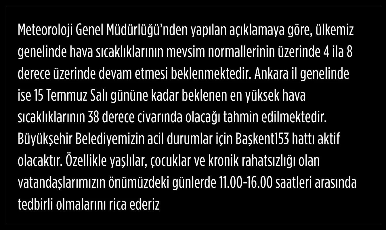 Ankara Büyükşehir, Ankara il genelinde ise 15 Temmuz Salı gününe kadar beklenen en yüksek hava sıcaklıklarının 38 derece civarında olacağının tahmin edildiğini ifade etti.