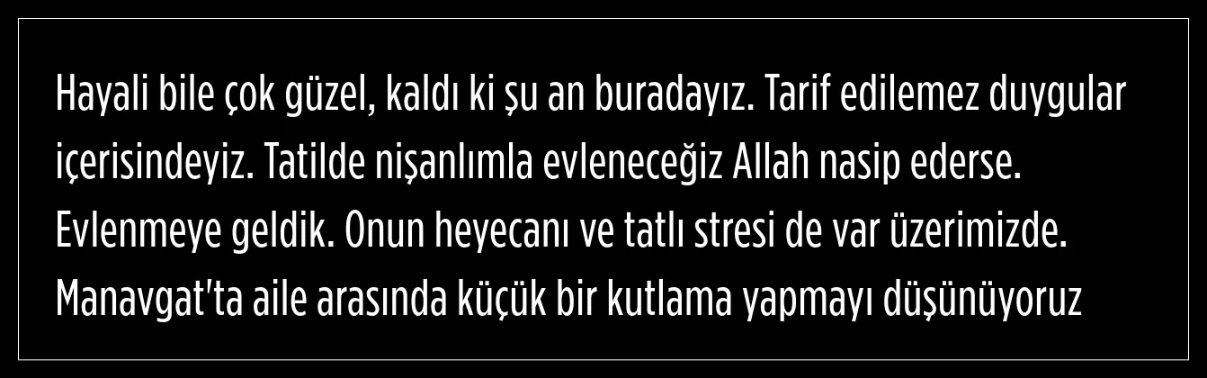 Bostan, vatanına kavuşmanın gurbette yaşayanlar için paha biçilmez olduğunu söyleyerek, bir yıldır bu anı beklediklerini söyledi. 11 ay 4-5 hafta izin yapmak için çalıştıklarını ifade eden Erdal Bostan, kapıdan girdiğinde Türk Bayrağı'nı görmenin çok güzel bir duygu olduğunu ifade etti.