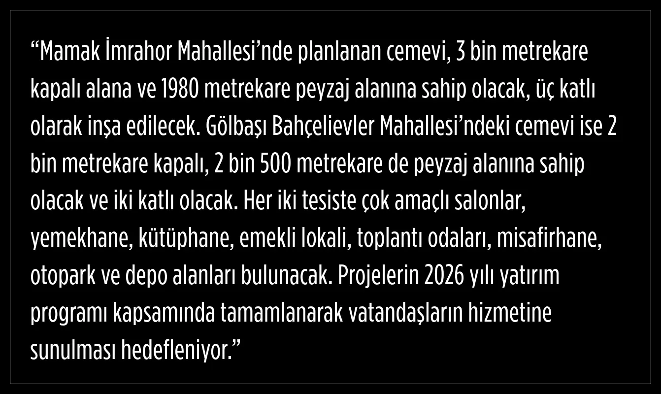 Başkan Yavaş, konuşmasının devamında iki yeni cemevi projesini de kamuoyuna duyurdu. “Mamak ve Gölbaşı ilçelerinde hayata geçirilecek cemevi projeleri için gerekli bakanlık izinlerini aldık, proje süreçleri başladı,” diyen Yavaş, detayları şöyle paylaştı: