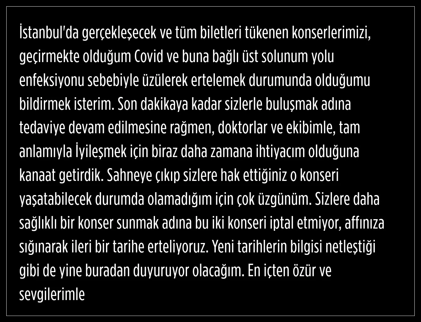 Şarkıcı, koronavirüs ve buna bağlı gelişen üst solunum yolu enfeksiyonu nedeniyle konserlerinin ertelendiğini duyurdu.