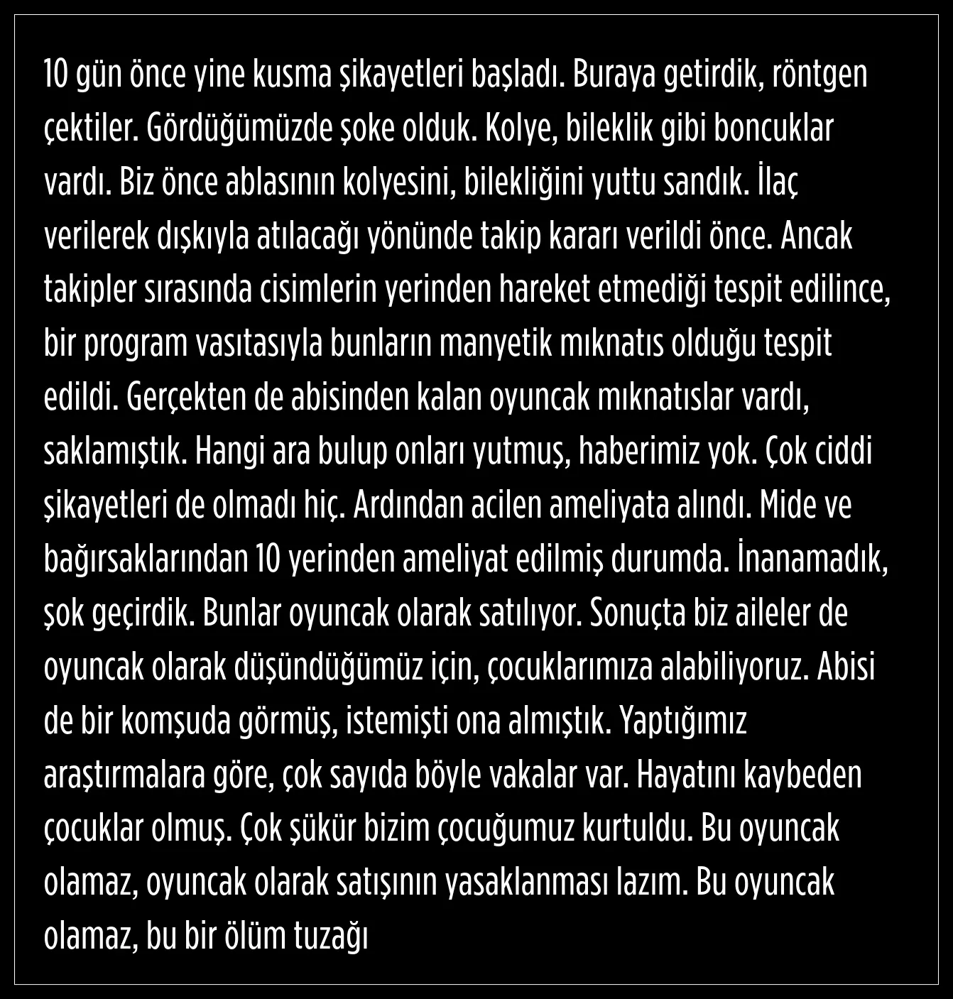 Dr. Çakmak, son zamanlarda manyetik boncuklara ilişkin başvuruların oldukça arttığına dikkat çeken Dr. Çakmak, sadece hastanelerinde neredeyse ayda 3-4, bazen 5 vakada yabancı cisim yutma ya da mıknatıs yutmaya rastlar olduklarını belirtti. Bu hastaların çok ciddi ameliyatlar geçirdiğini ifade eden Çocuk Cerrahi Uzmanı Opr. Dr. Mehmet Çakmak, aynı anda birkaç organın onarılmasının oldukça risk teşkil ettiğini söyledi. Çakmak, çünkü onarılan bölgelerde herhangi bir kaçak olması durumunda hastanın hayatını tehdit ettiğini belirtti. Hasta ne kadar çok sayıda boncuk yutarsa riskin daha da arttığını aktaran Dr. Çakmak, şu ana kadar en fazla sayıdaki magnet boncuk yutma vakası bu olduğunu söyledi. Çocuk cerrahları olarak magnet boncukların oyuncakların satışının yasaklanmasını istediklerini aktaran Çakmak, hastaların çok ciddi ameliyatlar geçirdiğini, hayati tehlikenin söz konusu olduğunu dile getirdi.