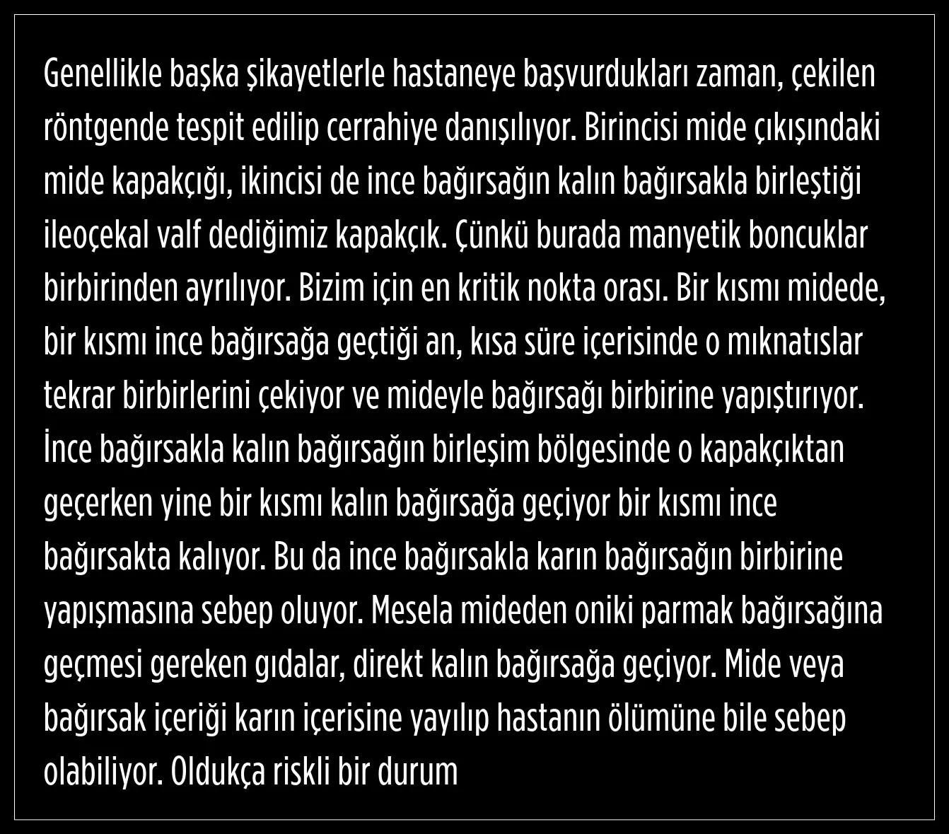 atma olasılıkları oldukça yüksek. Fakat çoklu mıknatıs yutma, acil bir vakadır. Çünkü midede, bağırsaklarda yapışıklıklara ve delinmelere sebep olabilecek potansiyele sahiptir. Bir program vasıtasıyla bunun manyetik bir cisim olduğunu fark ettik ve hastayı ameliyata aldık)