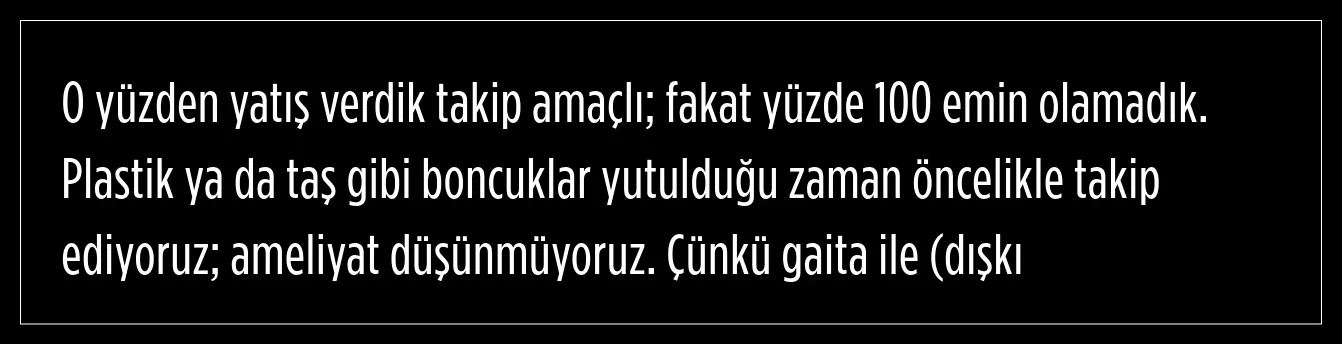 Ancak benzer belirtilerin geçen ay yeniden ortaya çıkması üzerine aile, bu kez Berfin’i Çam ve Sakura Şehir Hastanesi Acil Servisi’ne götürdü. Yapılan röntgen çekimlerinde mide ve bağırsaklarda boncuk benzeri yabancı cisimler tespit edildi. Başta kolye ya da bileklik yuttuğu sanılan küçük kızın, aslında manyetik boncuk yuttuğu anlaşıldı.