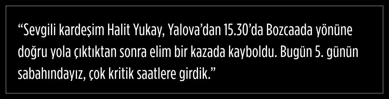 Marmara Adası açıklarında kaybolan Halit Yukay’ı arama çalışmaları 5. günde sürüyor. Kıvanç Tatlıtuğ, sosyal medyadan yardım istedi.