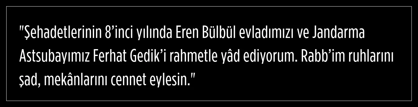 Cumhurbaşkanı Recep Tayyip Erdoğan, 11 Ağustos 2017 tarihinde Trabzon’un Maçka ilçesi kırsalında PKK'lı teröristlerce şehit edilen Eren Bülbül ve Jandarma Astsubay Ferhat Gedik için anma mesajı yayımladı.