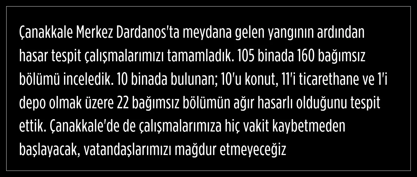 Bakan Murat Kurum, Çanakkale'de kontrol altına alınan yangın sonrası hasar tespit çalışmalarını tamamladıklarını ifade ederek, bilançoyu açıkladı.