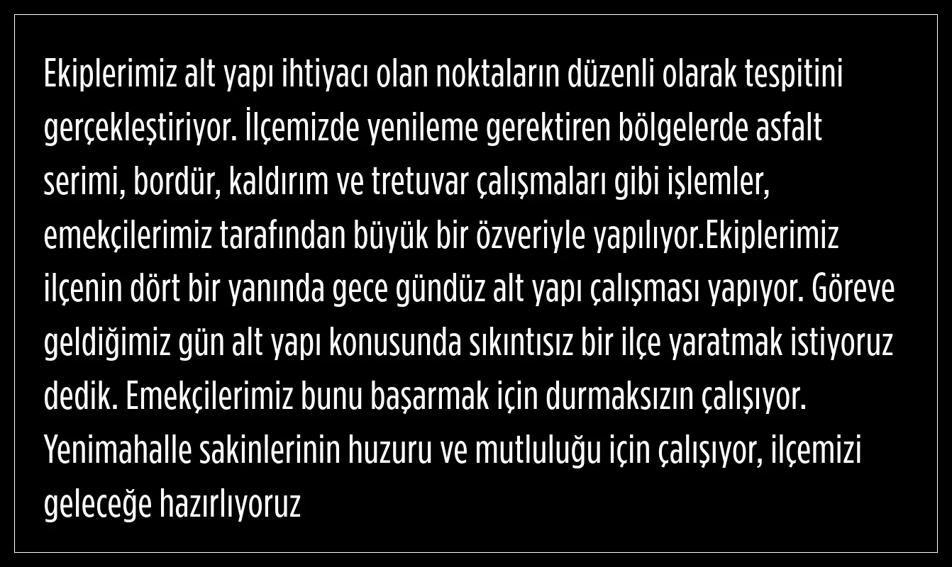 Yenimahalle Belediye Başkanı Fethi Yaşar, ekiplerin alt yapı ihtiyacı olan noktaların düzenli olarak tespitini gerçekleştirdiğini ifade etti.