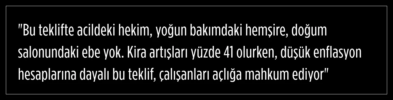 Sağlık-Sen, hükümetin sunduğu yüzde 10+6 zam teklifini ''açlık sınırının altında'' bulduğunu açıkladı. Sendika, sağlık çalışanlarının enflasyon karşısında eriyen maaşlarına dikkat çekerek adil ücret talebini yineledi.