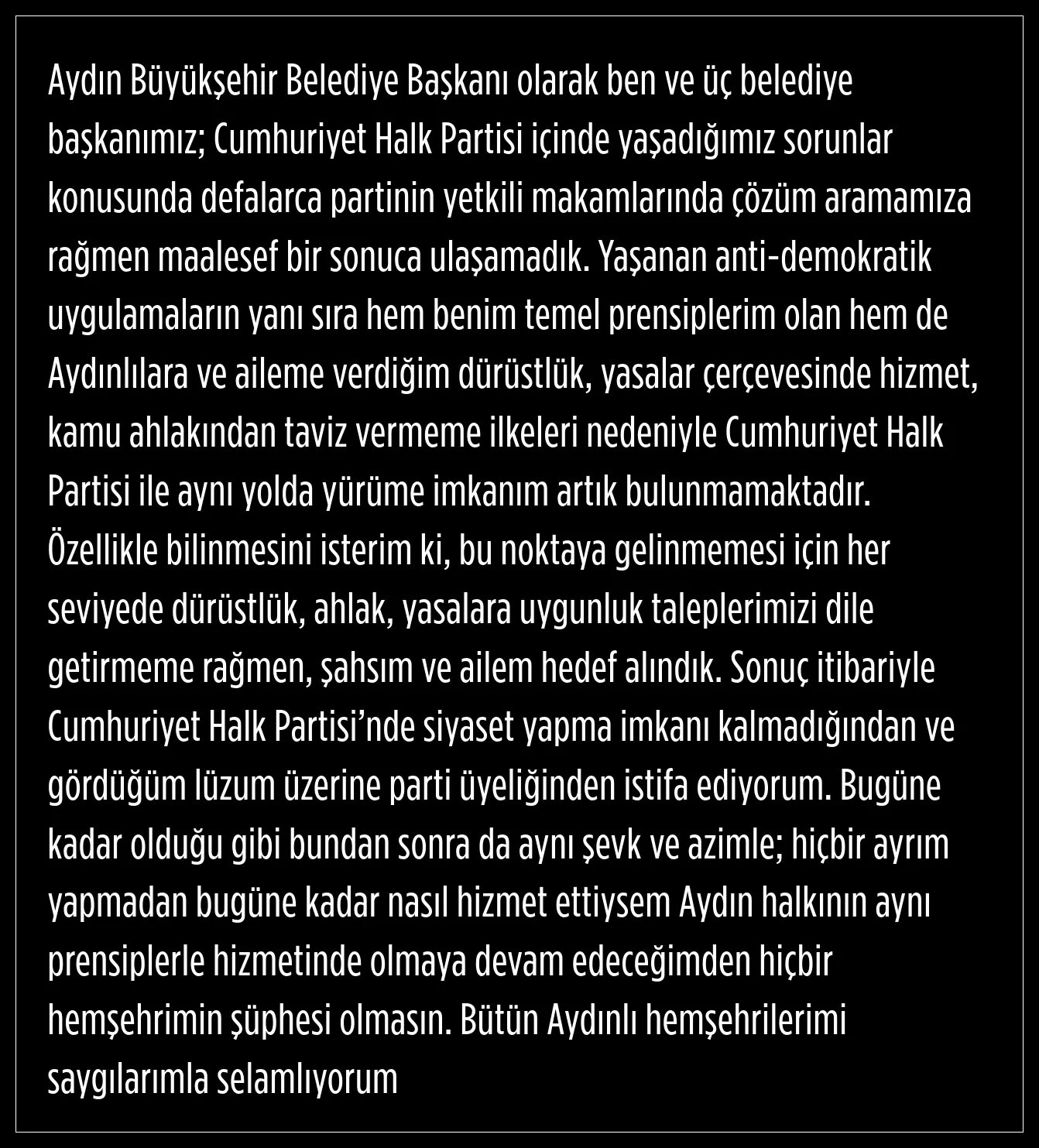 2009 yılından bu yana Aydın Büyükşehir Belediye Başkanlığı görevini yürüten Çerçioğlu, partisinden istifa ettiğini duyurdu.