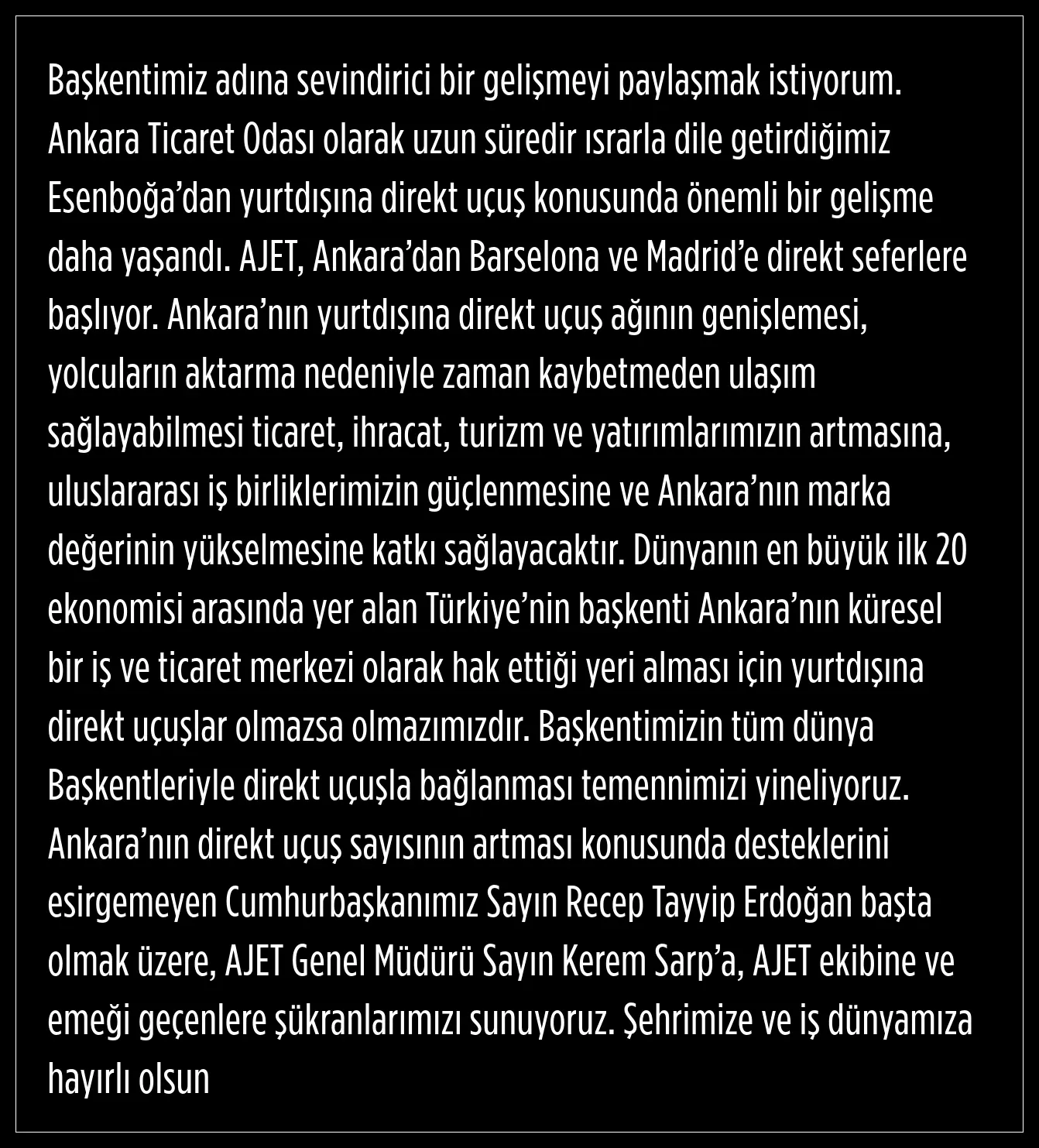 ATO Başkanı Gürsel Baran, Ankaralılara müjdeli bir haberi duyurdu. Baran, Ankara'dan Barselona ve Madrid’e direkt uçuşun başlayacağını söyledi.