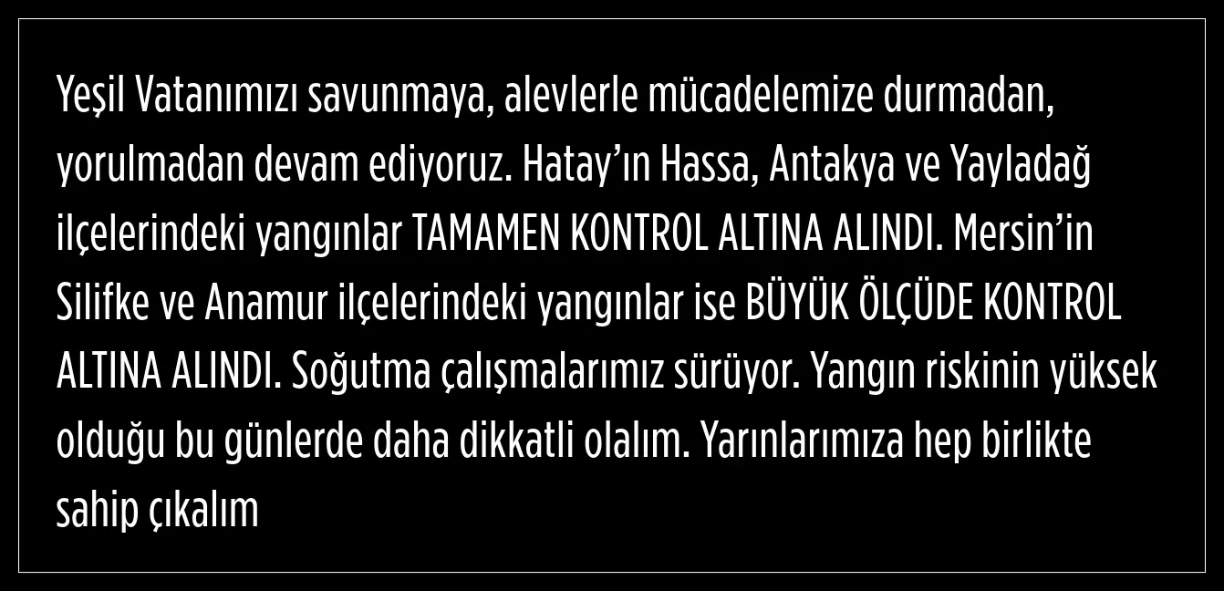 Yumaklı, Hatay ve Mersin'deki yangınların tamamen kontrol altına alındığını duyurdu.