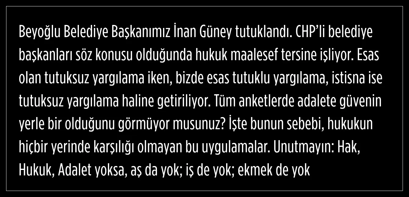 ABB Başkanı, tüm anketlerde adalete olan güvenin yerle bir olduğunu, bunun sebebinin hukukun hiç yerde karşılığı olmayan bu uygulamalar olduğunu söyledi.
