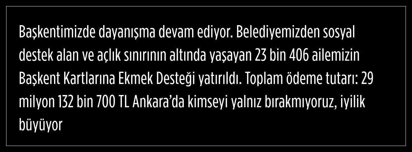 Ankara Büyükşehir Belediyesinin resmi sosyal medya hesabından yeni desteğe ilişkin yapılan açıklamada, Ankara'da kimsenin yalnız bırakılmadığı ve iyiliğin büyütüldüğü ifade edildi.