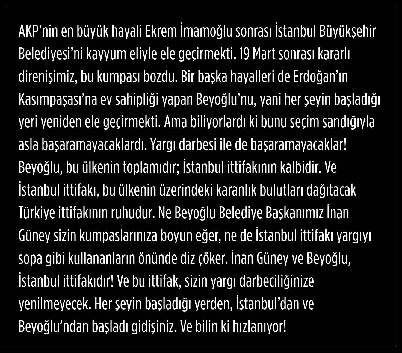 İnan Güney'ın kumpaslara boyun eğmeyeceğini söyleyen Murat Emir, İnan Güney ve Beyoğlu'nun İstanbul ittifakı olduğunu kaydetti.