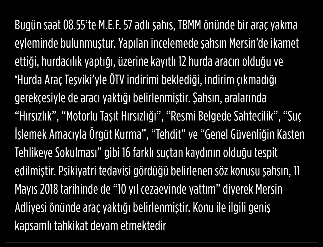 İçişleri Bakanlığı, bir şahsın TBMM önünde toros marka araba yakmasıyla ilgili açıklama yaptı. Bakanlık şahsın 16 farklı suçtan kaydının olduğunu açıkladı.