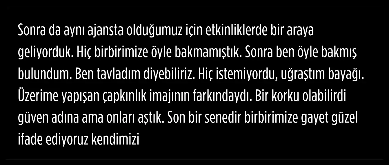 5-6 sene öncesinde bir reklam filminde beraber oynarken tanıştıklarını ancak o zaman aralarında bir şey olmadığını söyleyen Aka, şöyle devam etti: