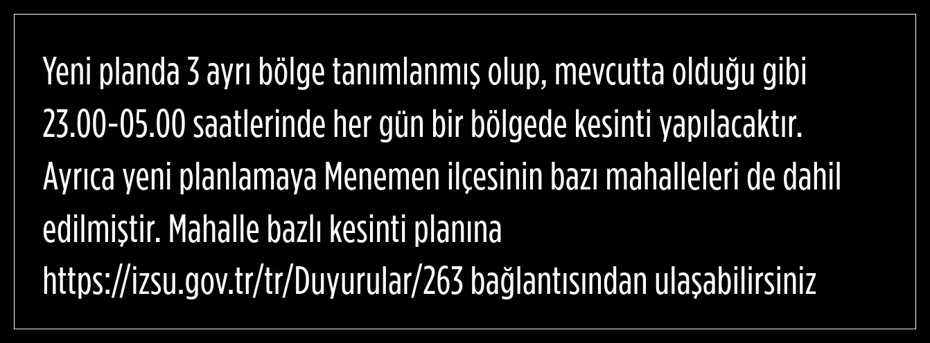 İZSU bünyesinde oluşturulan Su Kurulu, kent genelinde yaşanan kuraklık ve su kaynaklarındaki azalmayı gerekçe göstererek 6 Ağustos’tan itibaren gece 23.00 ile sabah 05.00 saatleri arasında kısmi su kesintileri uygulanacağını açıklamıştı. Daha önce yapılan 19 Ağustos açıklamasında, planlı kesintilerin 31 Ağustos’a kadar süreceği belirtilmişti.