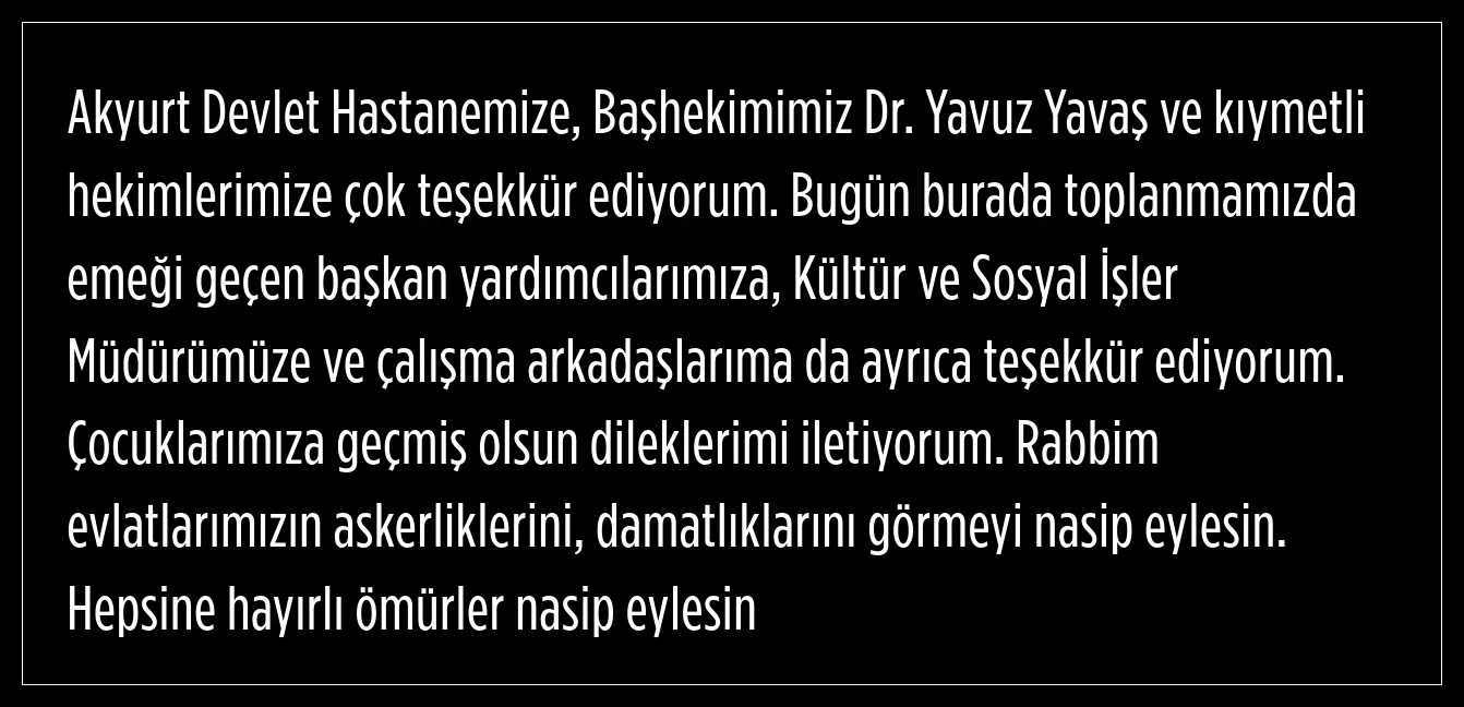 Kültür Merkezi düğün salonunda yapılan programa; Akyurt Belediye Başkanı Hilal Ayık, AK Parti Akyurt İlçe Başkanı Murat Yıldırım, yönetim kurulu üyeleri, belediye başkan yardımcıları, meclis üyeleri, Akyurt Devlet Hastanesi Başhekimi ve hastane yönetimi ile çok sayıda davetli katıldı. Sivil toplum kuruluşlarının temsilcileri, aileler ve çocuklarla birlikte yaklaşık bin kişi etkinlikte bir araya geldi.