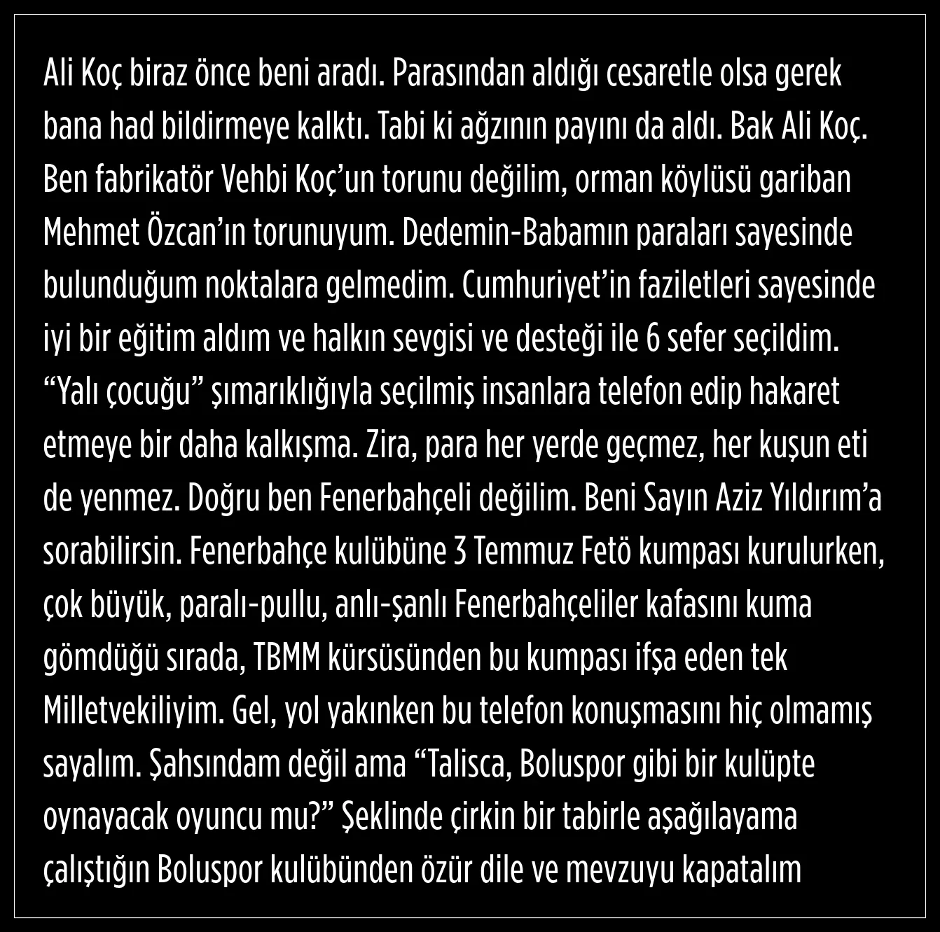 Fenerbahçe Başkanı Ali Koç, Bolu Belediye Başkanı Tanju Özcan'a arasında gerginlik. Özcan, ''Ali Koç biraz önce beni aradı. Had bildirmeye kalktı.'' dedi.