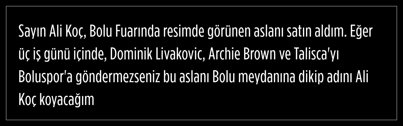 Bolu Belediye Başkanı Tanju Özcan, sosyal medya hesabı üzerinden bir paylaşım yaparak, Ali Koç'tan Dominik Livakovic, Archie Brown ve Talisca'yı Boluspor'a göndermesini istedi. Özcan, futbolcuların gönderilmediği takdirde Bolu meydanına aslan dikerek ismini Ali Koç koyacağını söyledi.