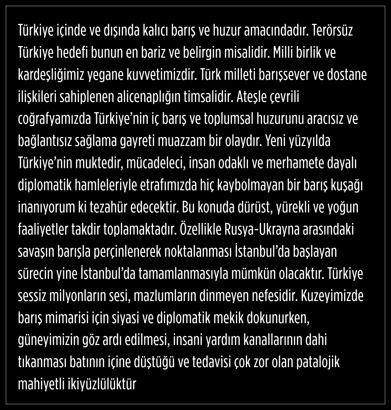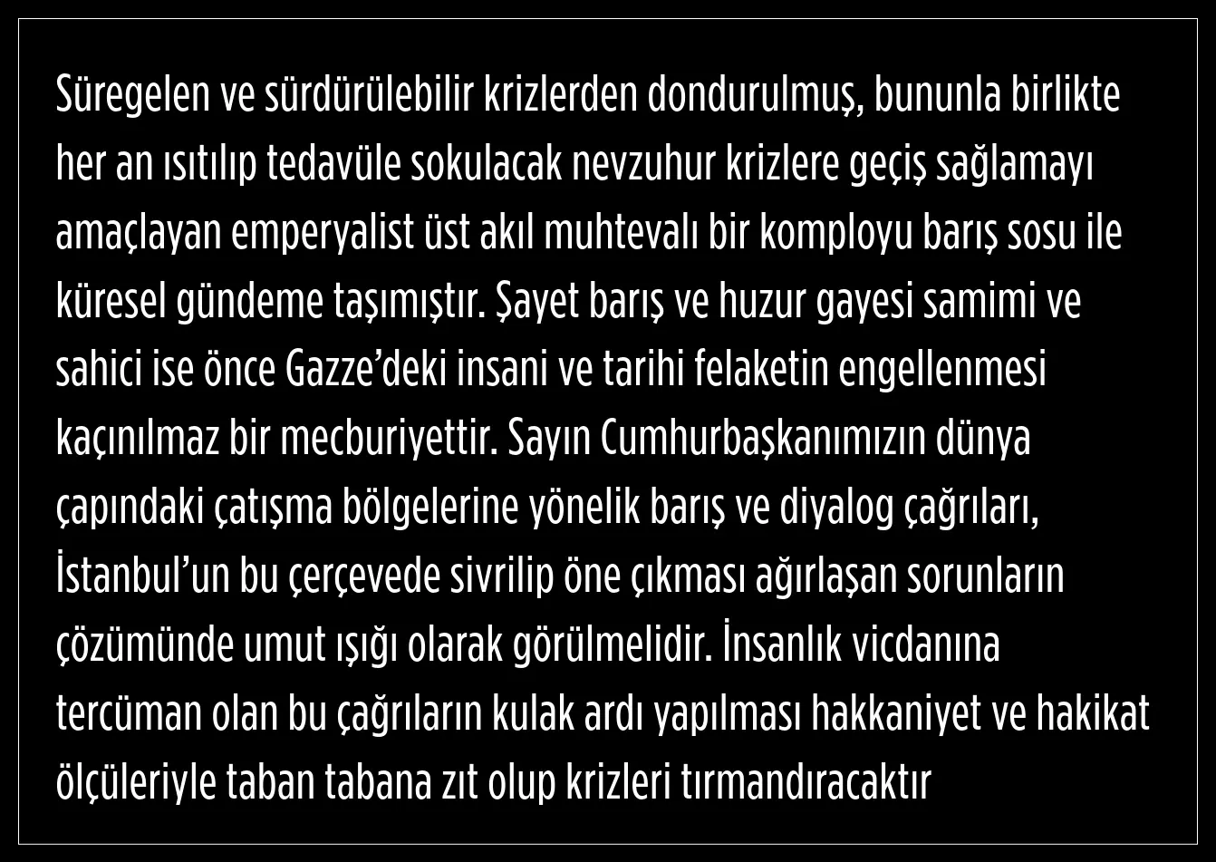 "Türkiye’nin duruşu, bölgesel ve küresel bağlamda paylaştığı ısrarlı görüşler ortadadır" diyen Devlet Bahçeli, Bu nedenle TBMM’nin olağanüstü toplanmasına yer ve gerek olmadığını dile getirdi.