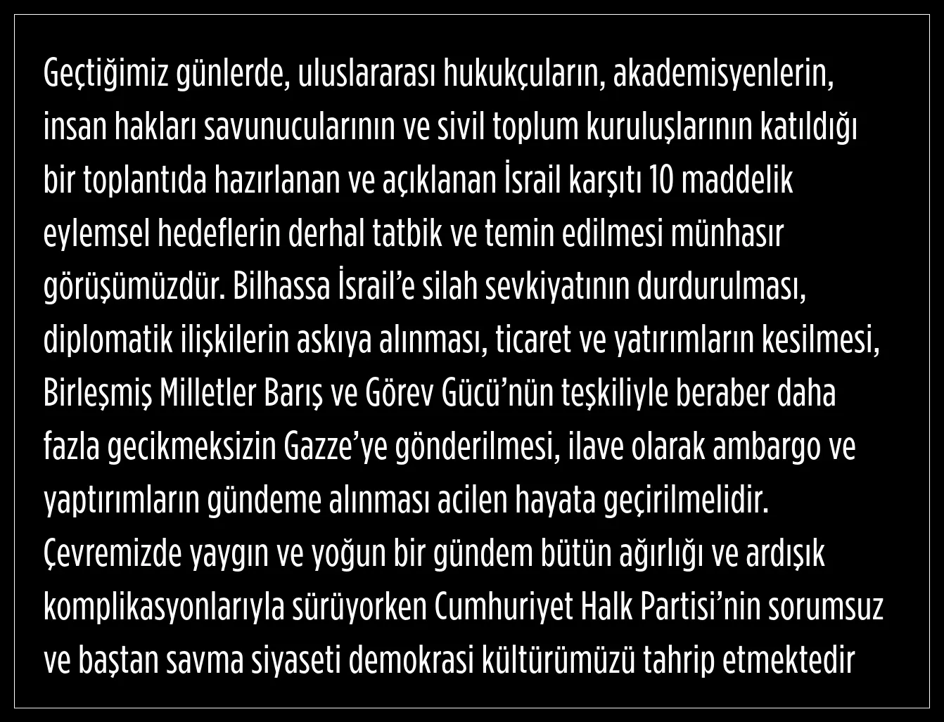 MHP Genel Başkanı Bahçeli, Cumhuriyet Halk Partisi (CHP) Genel Başkanı Özgür Özel'in TBMM'yi Gazze için olağanüstü toplantıya çağırmasıyla ilgili de konuştu.