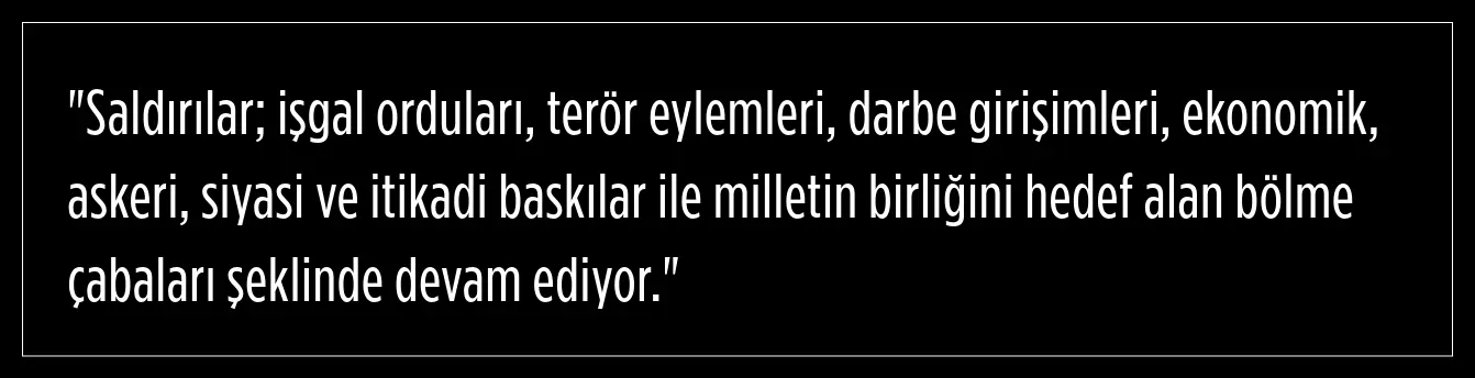 Destici, hangi koşulda olursa olsun kutsal vatan topraklarında özgür ve bağımsız yaşamın süreceğini vurguladı. Türk milletinin varlığına yönelen tehlikeleri, imkânsızlıklar içinde bile ortadan kaldıracak irade ve güce sahip olduğunu belirtti.