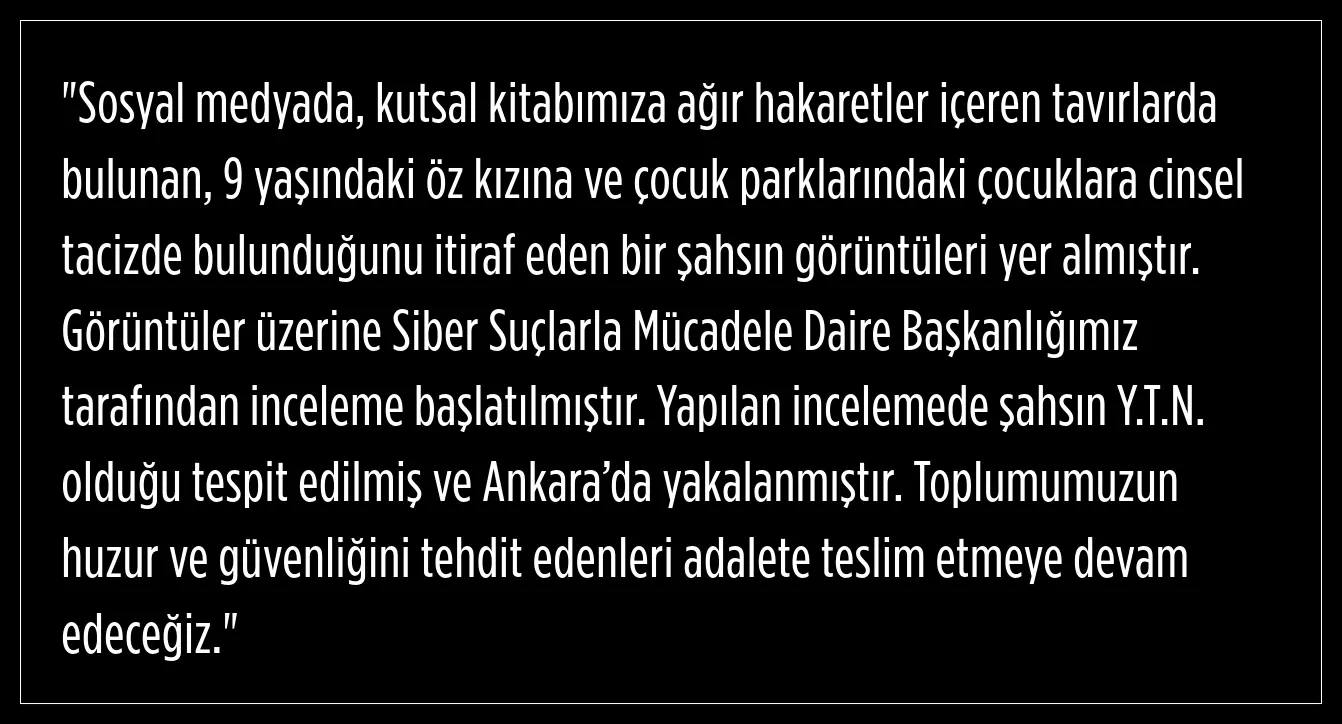 Ankara'da yaşayan Yasin Tunahan N. isimli sapık, 9 yaşındaki kızı ile çocuk parklarındaki çocuklara cinsel tacizde bulunduğunu itiraf ettiği ve aynı zamanda Kur'an-ı Kerim'e ağır hakaretler içeren görüntüleri sosyal medya üzerinden yayımladı.