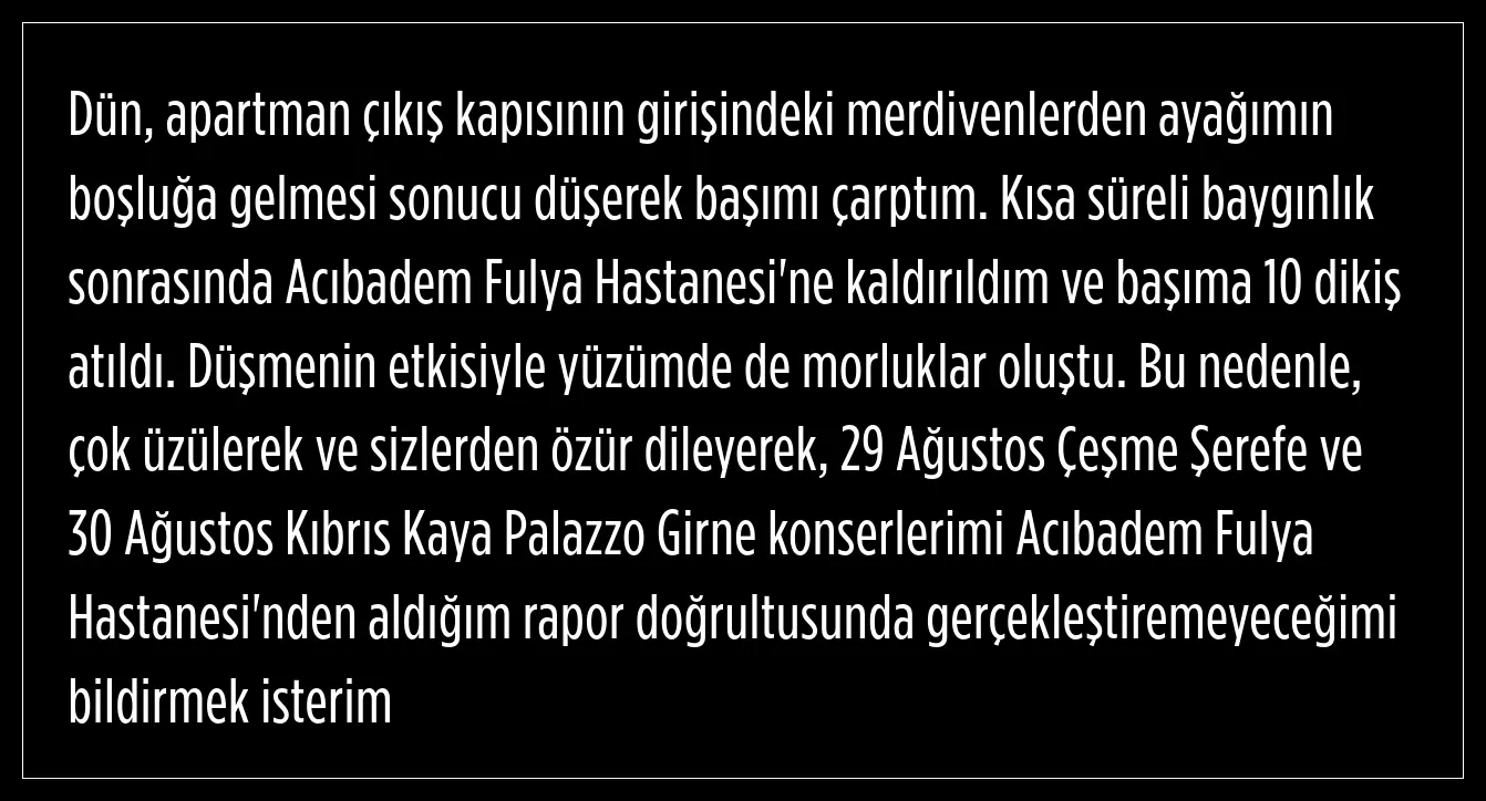 Ünlü şarkıcı, sosyal medya hesabı üzerinden yazılı bir açıklama yaparak, talihsiz bir kaza geçirdiğini duyurdu.